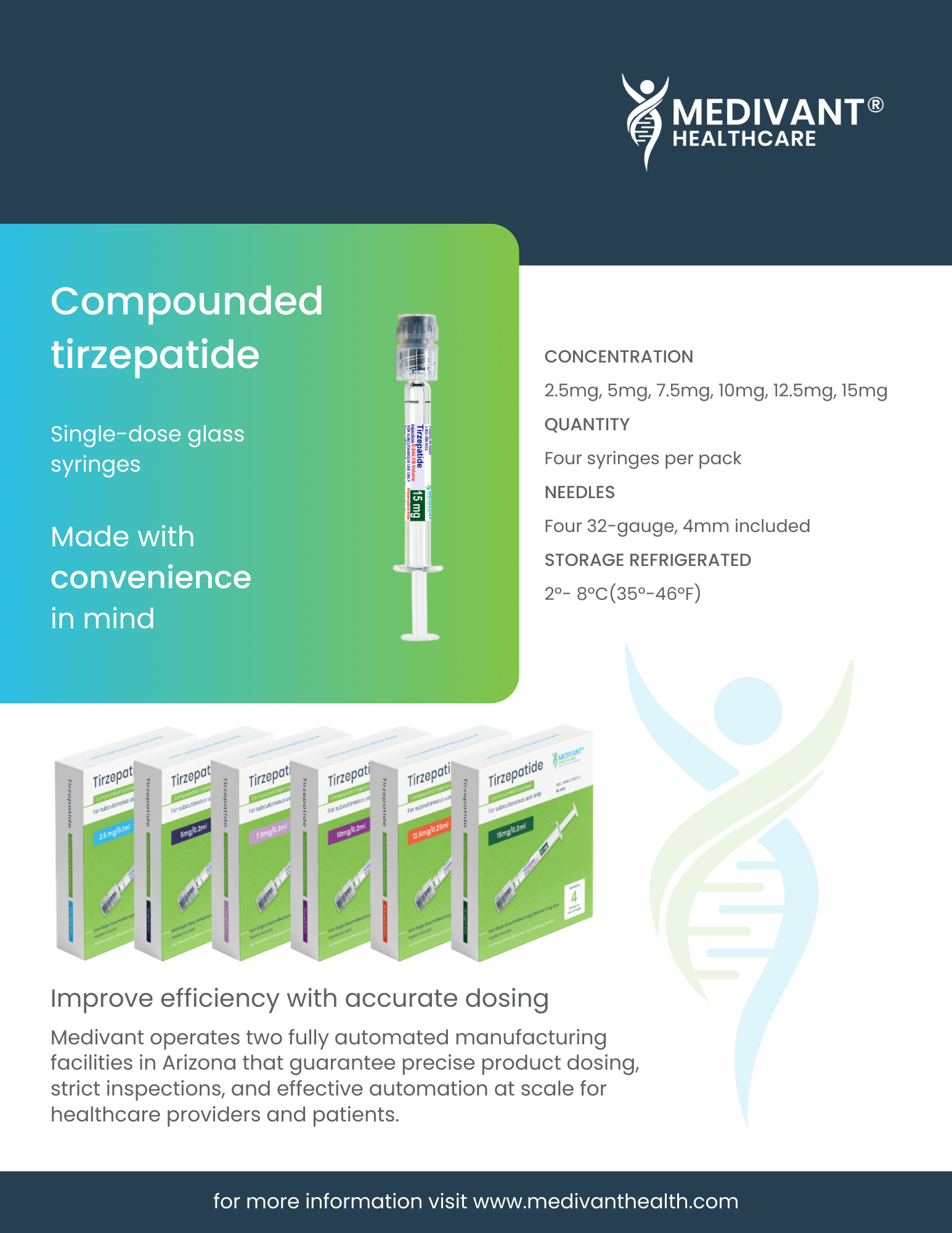 The compounded tirzepatide one-pager is a concise, informative resource designed to educate healthcare providers about Medivant's compounded tirzepatide in single-dose syringes. With a clear and compelling layout, it is an essential marketing asset for providers looking to offer personalized solutions while reinforcing the value of compounded medications in optimizing patient care.